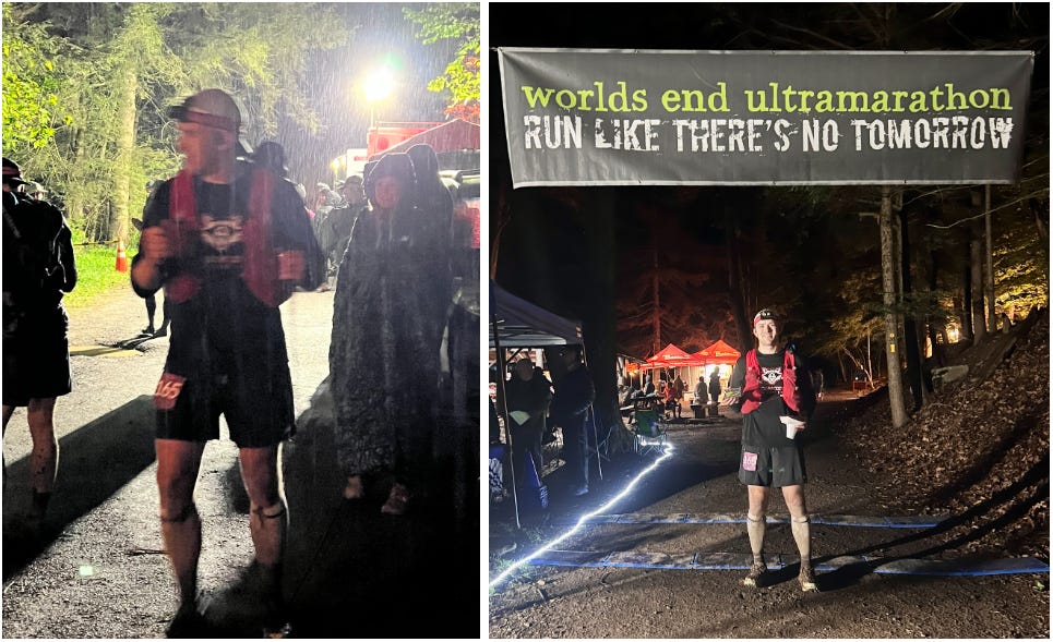 After 5 hours in the woods, I rolled through Worlds End aid station with Andrew and Adam. A taste of civilization. I swapped into fresh socks, refueled, and realized that I was still feeling good. I was still on time for my A-goal pace. Confidence was building, but there was so much this race had left to throw at me.