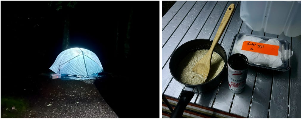 On race morning, at 3:15 AM in the pouring rain, I found myself under the canopy of my friend Adam’s camper. I drank a Celcius, ate 3 boiled eggs, cooked up one cup of oats for breakfast. I normally don’t eat my oats plain, but I forgot sugar or maple syrup. I tried to season them with salt, thinking something would be better than nothing, but I was so wrong. I made the boring, inoffensive oats taste downright diabolical. I ate them anyway.