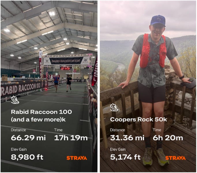 Races like the Rabid Raccoon 100k and Coopers Rock 50k earlier this year gave me a mental boost when I needed it most. Weekend back-to-backs taught my legs to keep moving even when the mind wanted to quit. I spent many Tuesday nights at “Hills and Friends”, a group of local runners I value and owe much of my development as a trail runner. Dozens of laps around Valley Forge Park with the group helped elevate my hill climbing game, and I didn't even notice the progress taking place over time because the company more than made up for the pain of running up Mt. Misery and Joy every week.