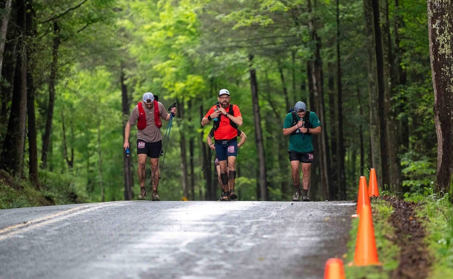 I couldn’t believe the rebound. Almost 40 miles in, and I was able to run! I was clocking nearly 8 minutes per mile as I flew downhill into Jackson Flats. I regrouped with my guys, and we started right into a section that was the opposite of “flat” — endless greasy climbs that tested every ounce of willpower.