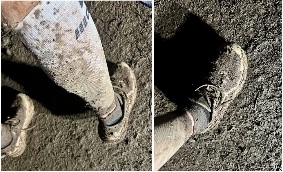 The next 30+ miles were a blur of mud, ladders, waterfalls, and moments that felt like hallucinations but weren’t. My legs ached, my head buzzed with I Think You Should Leave quotes (what else are you supposed to do while slopping it up, trudging through the wet, wet mud?) and every climb felt like it was longer than the last.